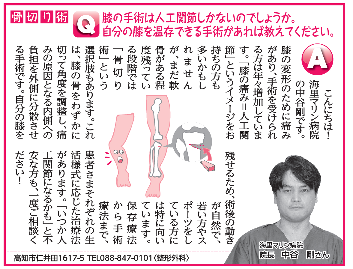 「人工関節以外の手術の選択肢(骨切り術)について」(整形外科 中谷剛医師 2025年12月10日 高知新聞健康の連絡便) ホーム > 健康の連絡便 > 「人工関節以外の手術の選択肢(骨切り術)について」(整形外科 中谷剛医師 2025年12月10日 高知新聞健康の連絡便)