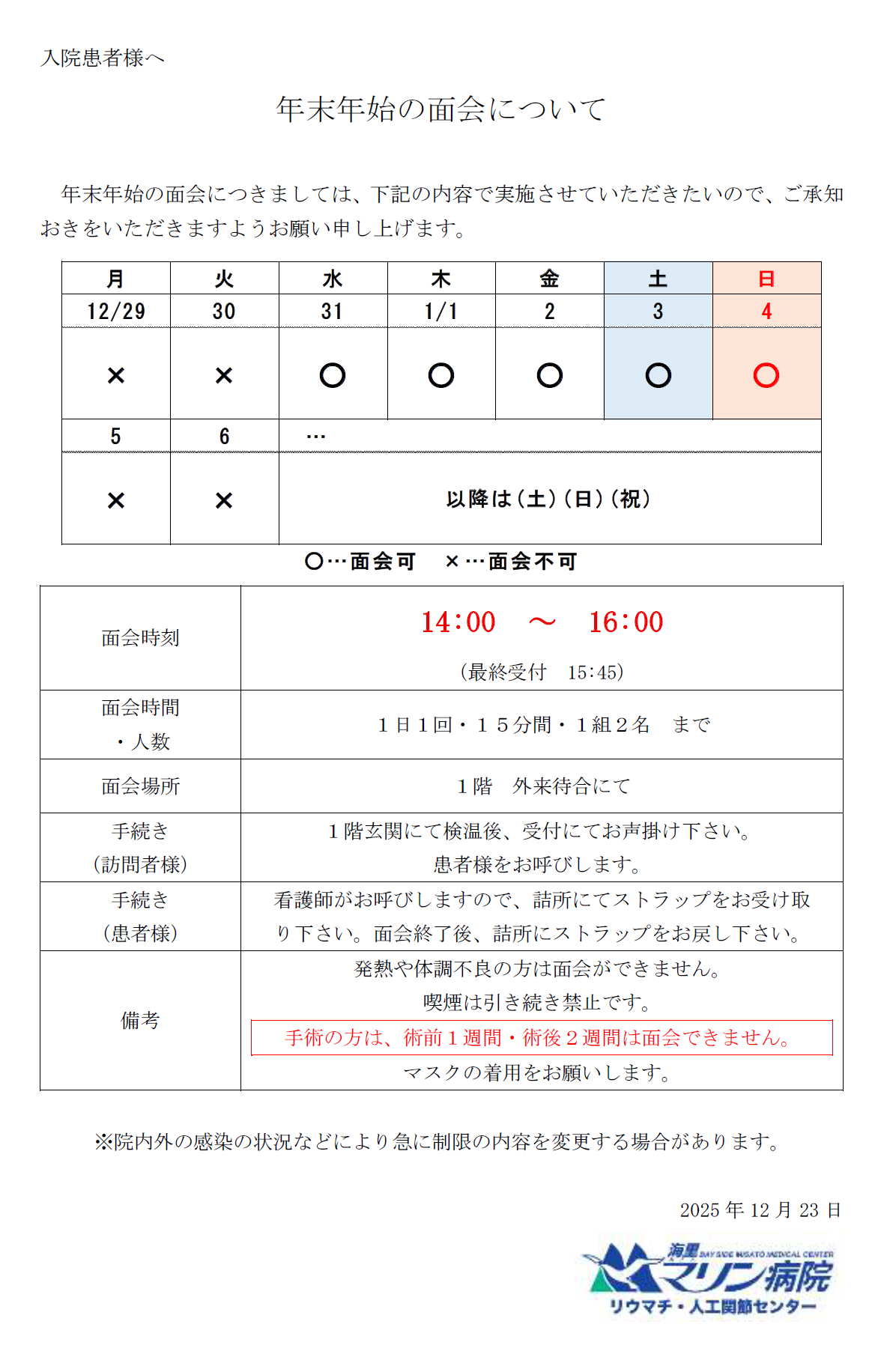 年末年始の面会について