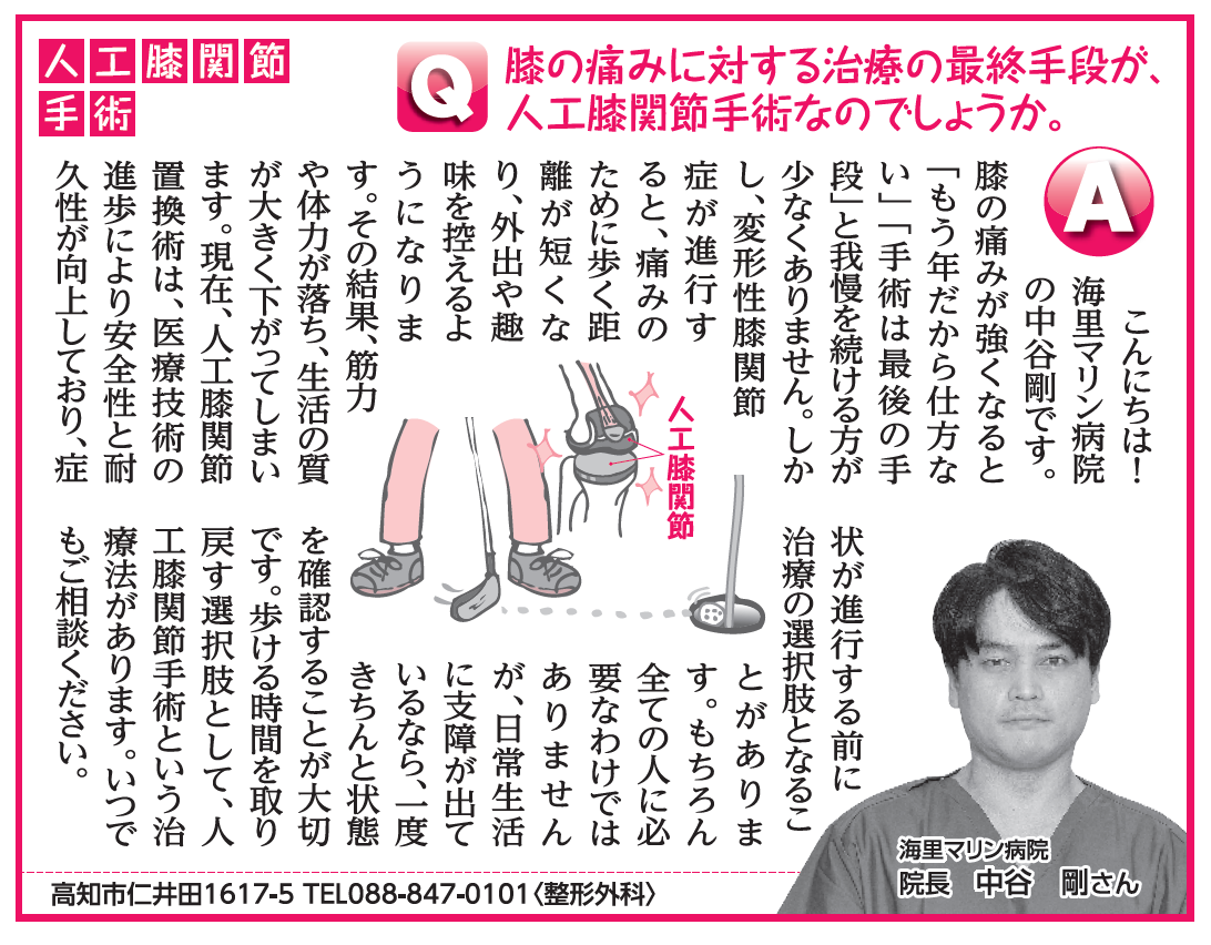 「人工関節置換手術は治療の最終選択肢か、について」(整形外科 中谷剛医師 2026年3月11日 高知新聞健康の連絡便) ホーム > 健康の連絡便 > 「人工関節置換手術は治療の最終選択肢か、について」(整形外科 中谷剛医師 2026年3月11日 高知新聞健康の連絡便)