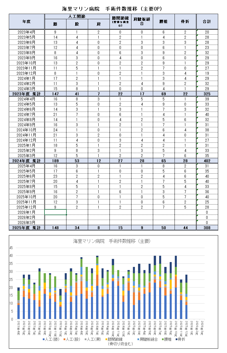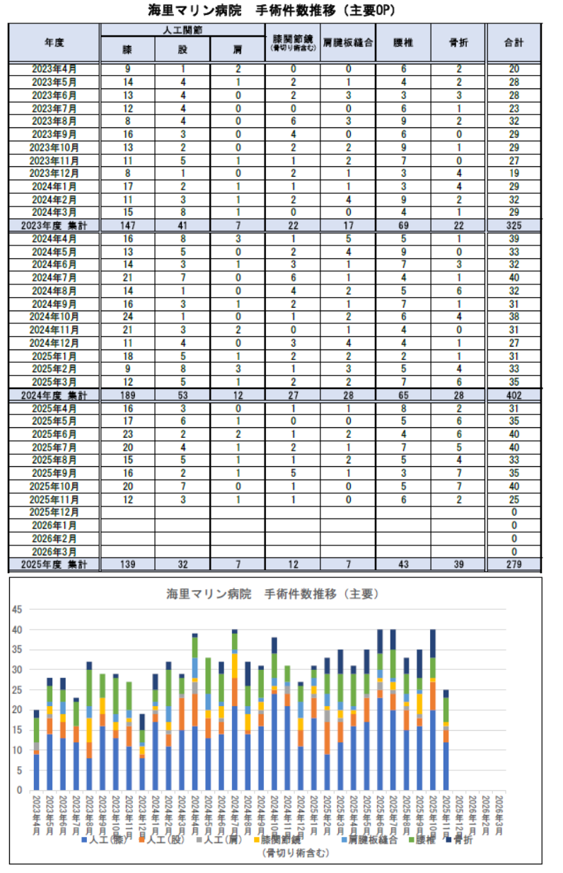 手術実績 ホーム > 手術について/手術実績 > 手術実績 手術実績 人工関節総数 10799件 膝関節 8002件 股関節 2180件 肘関節 320件 指関節 91件 その他 206件 2025年12月末現在 脊椎手術総数 3309件 2025年12月末現在